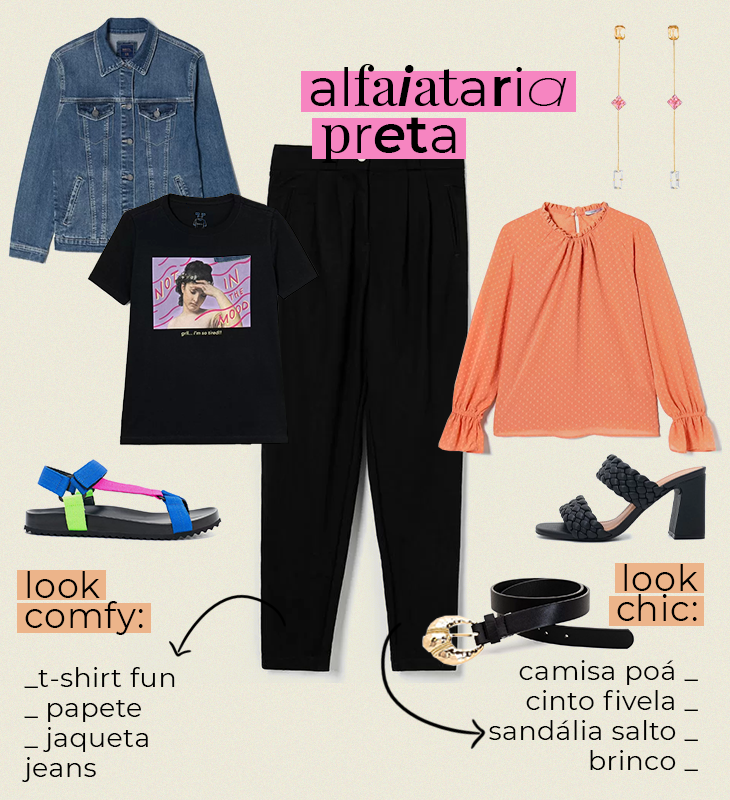 Seja dentro ou fora do clássico terninho, a calça de alfaiataria clássica pode ser sua maior aliada. Aposte em tecidos mais leves e confortáveis, mas que tenham o corte de alfaiataria – isso já muda totalmente a cara do look! Use com t-shirt e papete para um mood mais despojado, ou com salto e uma camisa mais elaborada para levá-la para o escritório e ocasiões mais formais.