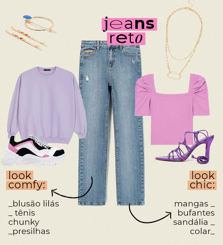 Além de ser o jeans queridinho da vez entre as fashionistas, o jeans reto possui aquela modelagem intermediária perfeita: nem muito apertado, nem muito largo. Vai do look super descontraído com blusão de moletom até o mais fashion com mangas bufantes e salto metalizado.