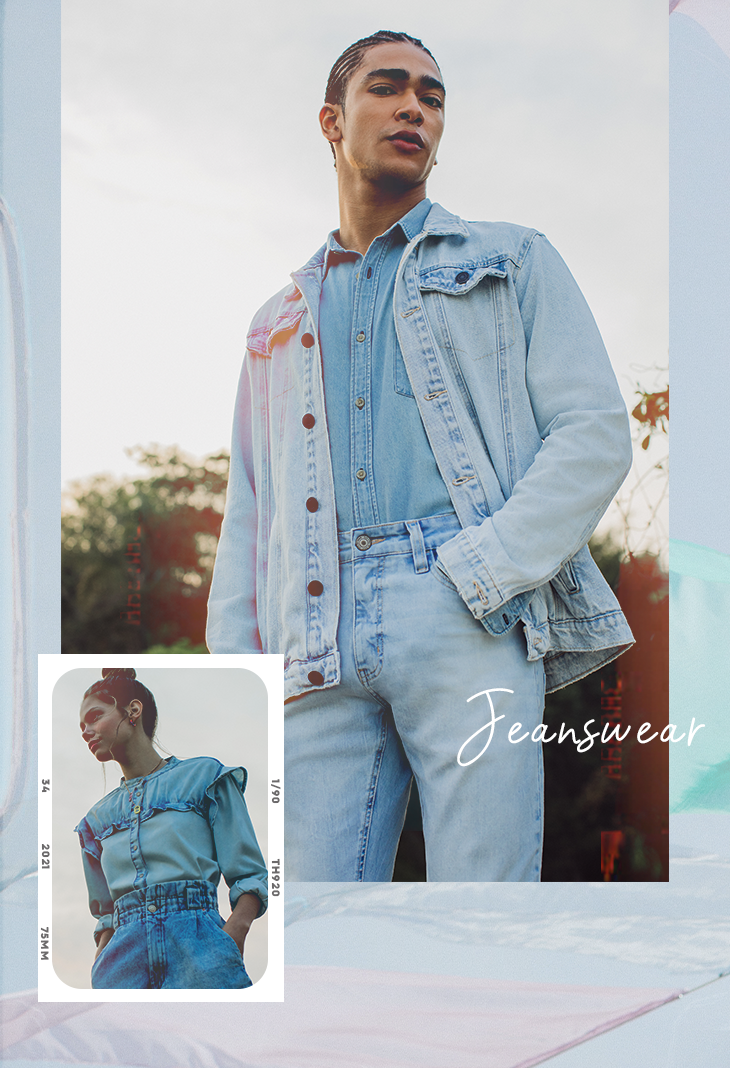 O jeans não foge da regra e também vem em formatos amplos, evidenciando a busca pelo conforto. Modelagens mais soltas como mom jeans, baggy e clochard são as grandes apostas da estação. Detalhes de babados e franzidos estão em alta e ficam bem marcados nas lavagens claras, que ainda funcionam super bem na trend double-denim (look total denim).