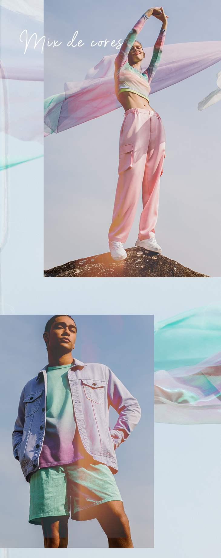 A estação pede cores vibrantes e intensas, mas a combinação delas com tons naturais e neutros é de longe o destaque da coleção. A cartela de tons pastel ácido conta com rosa claro, lavanda, azul natural, verde menta e crus, fazendo com que o mix fique completo e harmonioso.