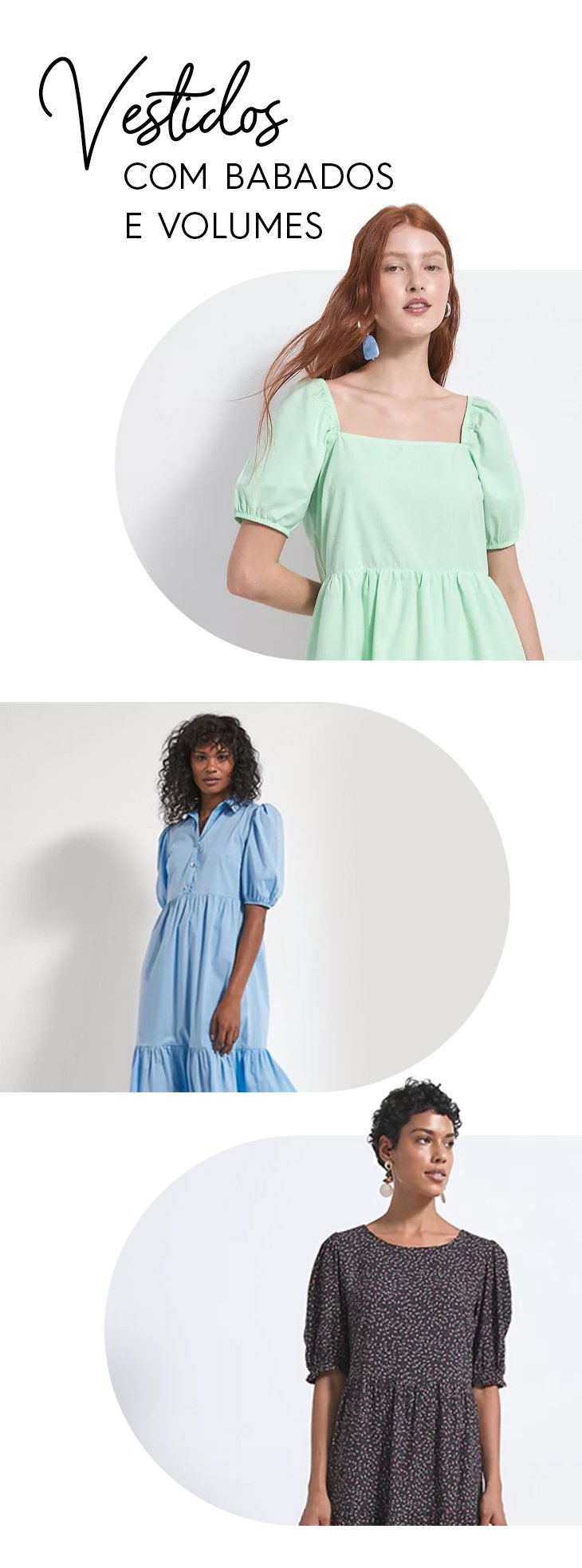 Os vestidos com volumes, recortes e babados são os mais novos queridinhos das fashionistas. Super fluido e com leve franzido babado nos recortes horizontais, combina muito com o mood mais romântico do estilo bohemian. As mangas bufantes, que deixam um volume charmoso nos ombros, são protagonistas em vestidos e blusas.