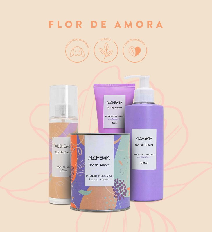 A linha Flor de Amora tem hidratante corporal, hidratante de banho, sabonetes e body splash. Todos os produtos não são testados em animais e são livres de parabenos. E tem mais: o hidratante corporal Flor de Amora tem vitamina E, um excelente antioxidante, que previne o envelhecimento precoce da pele. Já os sabonetes, além de um aroma incrível, são feitos a partir de base vegetal.