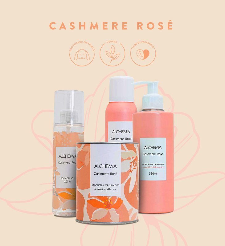 A linha Cashmere Rosé tem os mesmos atributos: produtos sem origem animal e livres de parabenos. Nessa linha, temos mousse de banho, body splash, sabonetes e hidratante corporal – esse último contém ácido hialurônico, que é um poderoso ativo para hidratação e fortalecimento da pele, ajudando a evitar a flacidez e o envelhecimento, pois estimula a produção de colágeno.