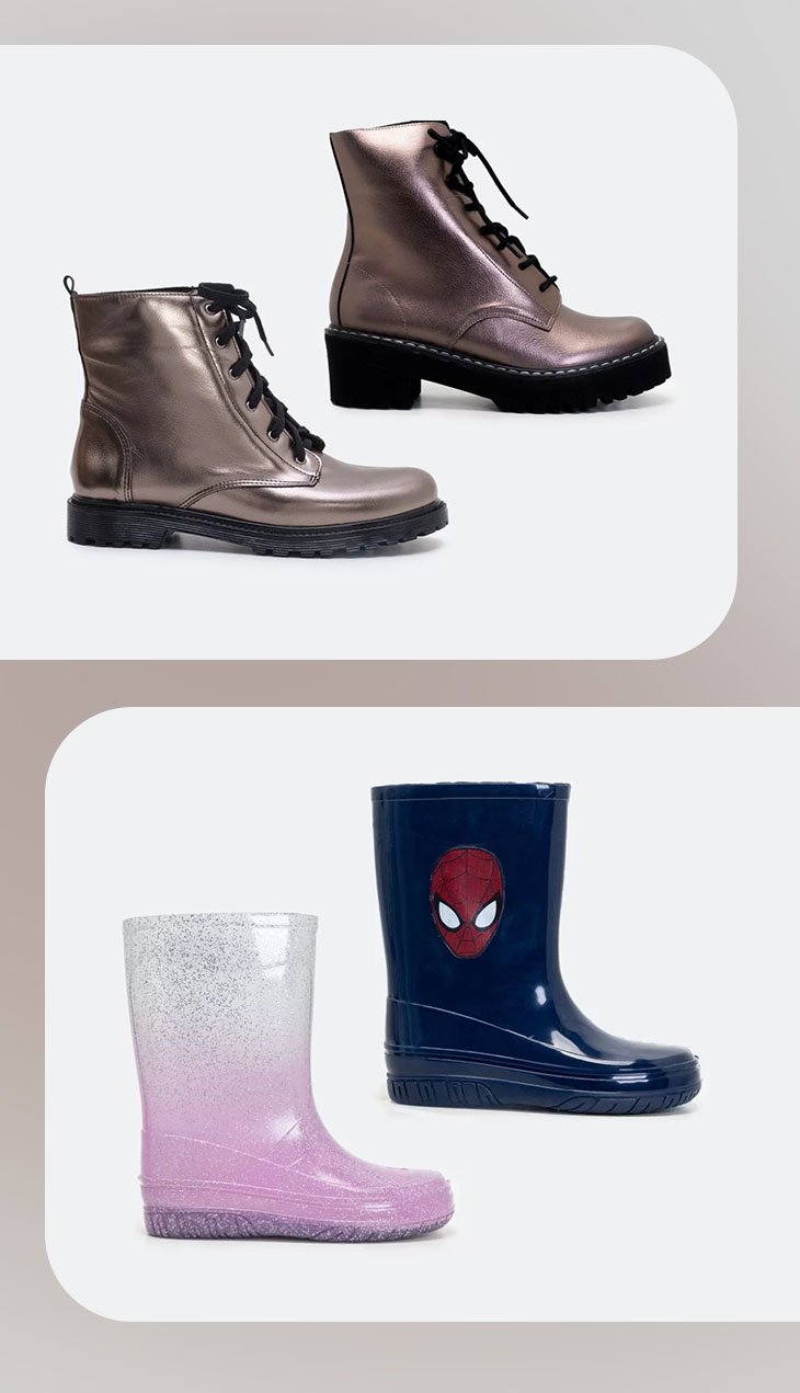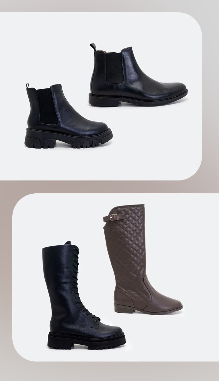 Os saltos continuam baixos e um dos solados da vez é o tratorado. As botas mais pesadas e esportivas, aliás, estão em alta, sejam os urbanos coturnos ao modelo de escalada, tipo hiking, e também as galochas, para adultos e crianças.