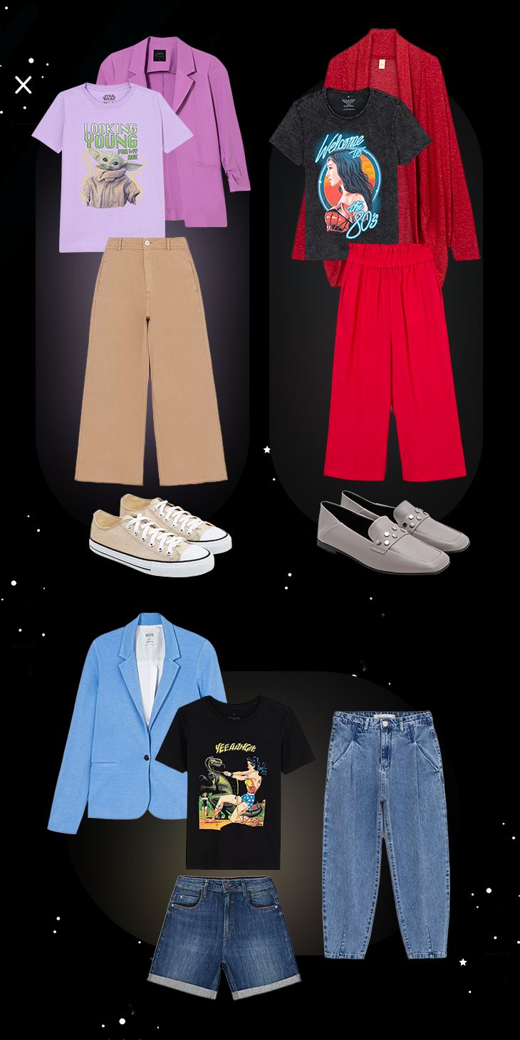 A onda geek é tão forte que até o dicionário Oxford incluiu, em 2013, o termo “geek chic”, cujo significado é: “as roupas, a aparência e a cultura associada aos entusiastas da computação e da tecnologia, considerados elegantes ou modernos.” O que isso significa na prática: camisetas de personagens, do baby Yoda à Mulher Maravilha, ficam ótimos com uma calça de alfaiataria de cintura alta, para dar aquele ar arrumado enquanto faz a conexão com a alfaiataria de um jeito fun com um blazer colorido. Arremate com um bom tênis ou um mocassim – ambos remetem ao estilo colegial – e, pronto! Outra opção: camiseta com jeans larguinho (pode ser mom, pantalona, slouchy, baggy, pantacourt: todos estão em alta) arrematado com um bom blazer. Ou ainda uma calça com tecido de alfaiataria colorida e um bom cardigã por cima, que tal?