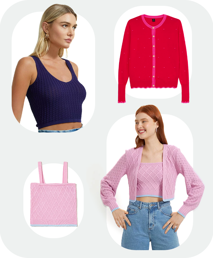 Nem só de roupas invernais se faz um conjunto de tricô, viu?! O trabalho manual tem ganhado tanta força que agora cria-se também regatas, croppeds e casaquetos. Veja que lindas essas combinações de texturas: