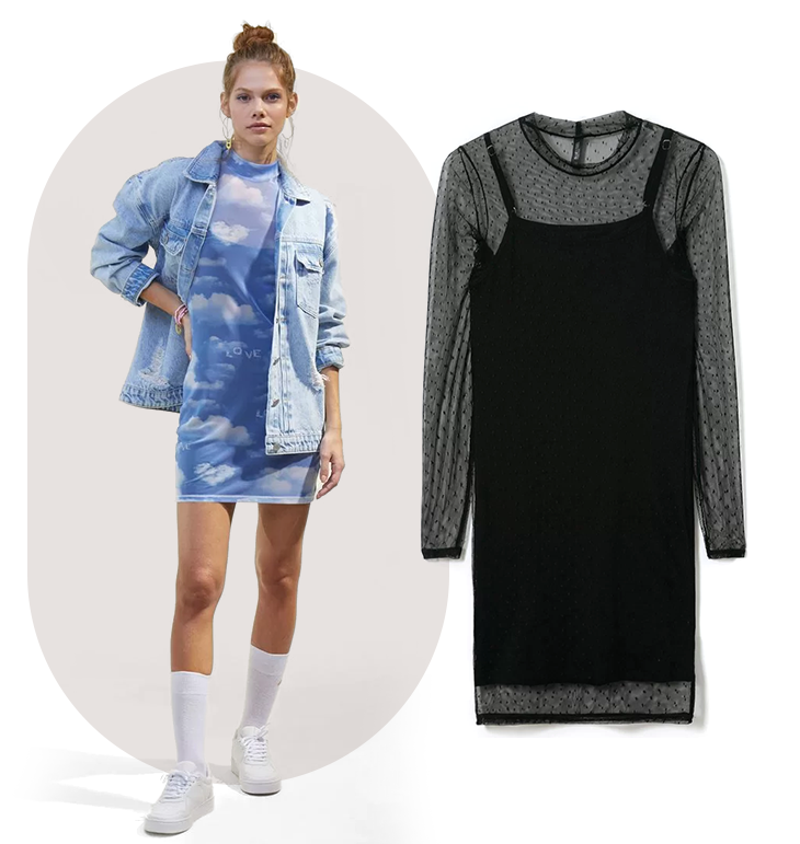 A transparência em vestidos tipo tubo ficou famosa após ser usada po ícones fashion da época. A gola alta sem manga é outro hit da década, como o modelo com estampa de nuvem abaixo.
