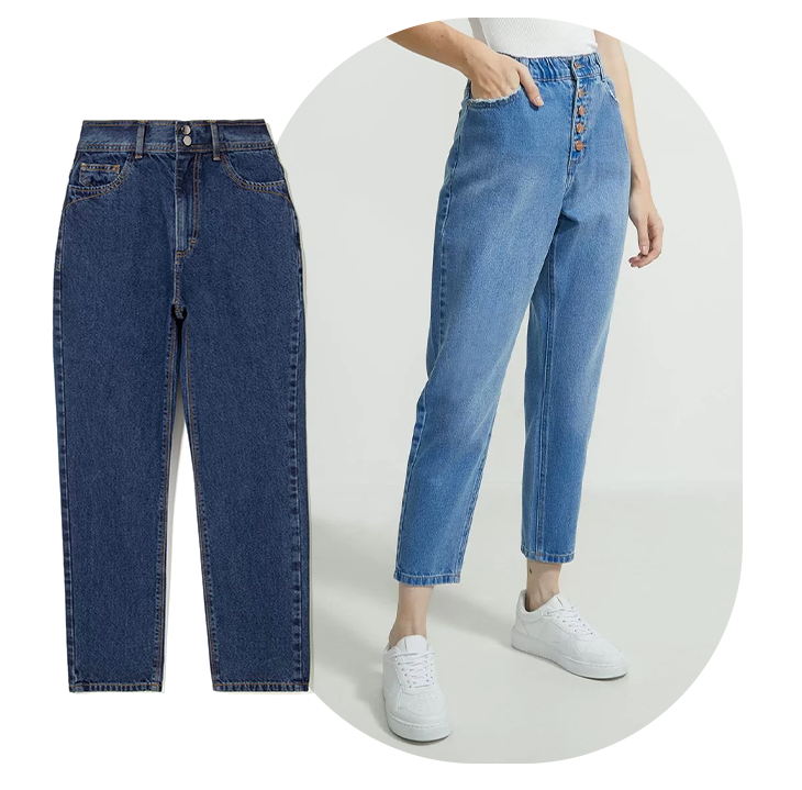 Se a calça tipo baggy é um ícone dos anos 80, a tipo mom é a rainha da década seguinte, em várias lavagens, da azul claro ao escuro, passando pelo black jeans.