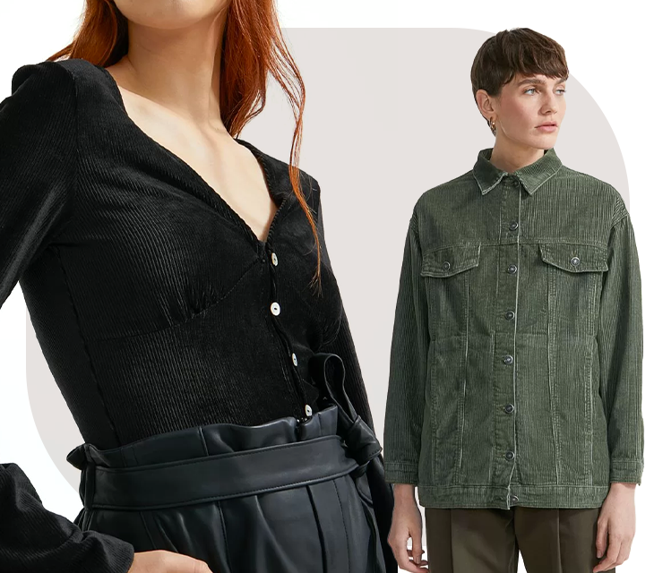 O veludo é “o” tecido de uma fase dos anos 90. No preto total, fica minimalista, outra trend da época. Colorido, ganha charme, tanto na versão de veludo liso da calça verde de bolinhas quanto na jaqueta de veludo cotelê.