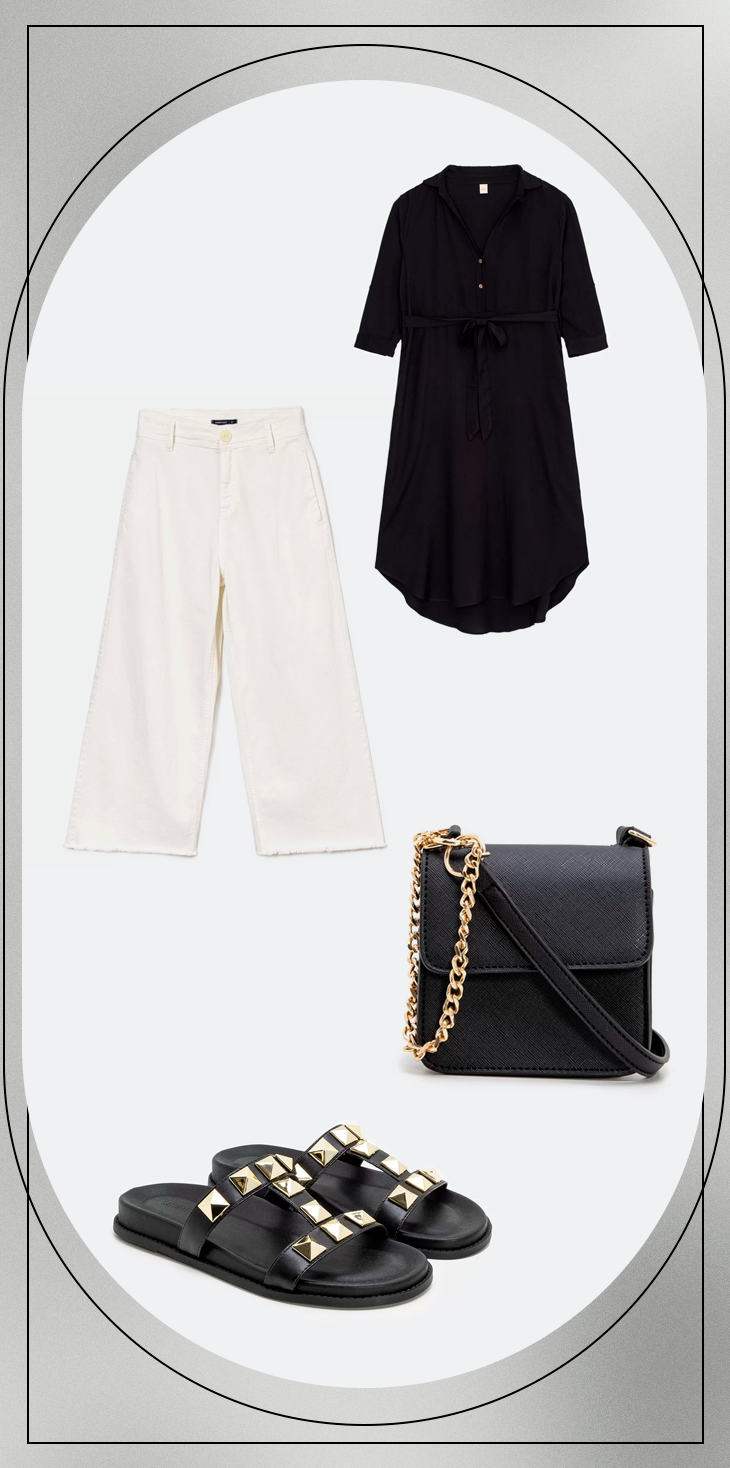 Já a Thaís optou por blusa preto e branco + calça fluida com elástico na cintura ou Wide Leg para um visual comfy. Arrematou com brincos dourados que combinam com a fivela do tamanco branco em tonalidade e design.