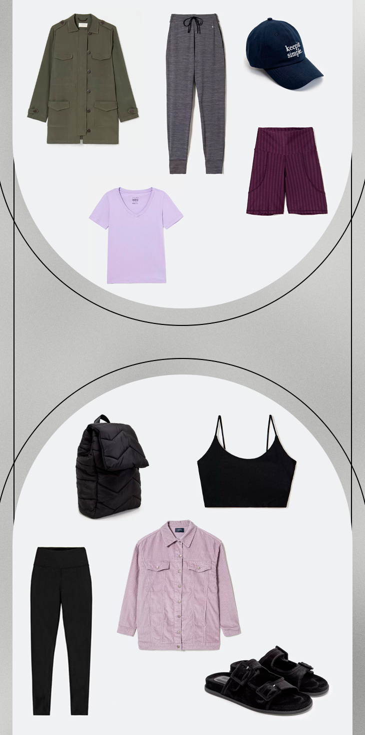 Maria Chagas propôs um conjunto de legging com top como base arrematado com uma jaqueta casual lilás e papete. O tênis ficou na mochila para ser usado na hora do treino!