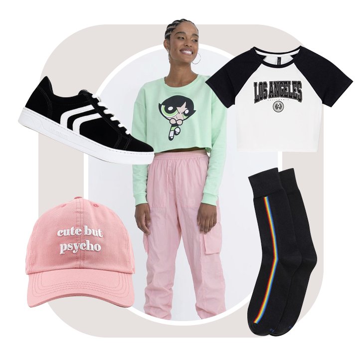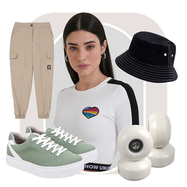 A diferença em relação ao streetwear é no tamanho das peças e na atitude. No skate, as calças são largas, com destaque para a cargo, usada por várias atletas femininas recentemente. Se for o caso, compre uma numeração maior. A cartela de cores é mais neutra, com preto, branco, cáqui. Mas dá para fazer uma licença poética com os tons pastel em alta, tipo o rosa claro, contanto que a atitude de bad girl permaneça, com peças oversized em foco. Na cabeça, bonés ou bucket hats.