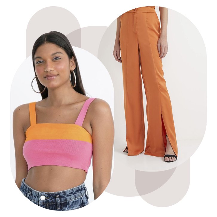 Você pode seguir a combinação com uma das cores do top bicolor e criar uma produção fashion e alegre ou trazer mais sobriedade apostando em tons neutros, como o bege, branco, preto ou caramelo. Os jeans de tonalidades mais escuras também cumprem esse papel neutralizador super bem.