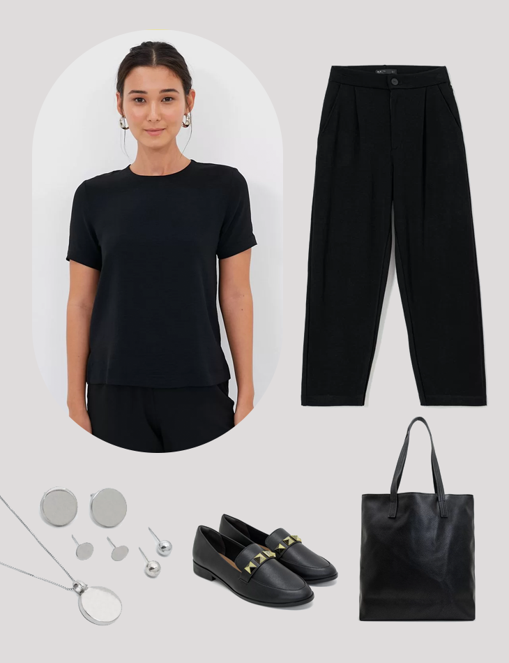 Agora, um look prático mas sem perder o estilo para ir ao trabalho? Aposte na camiseta + alfaiataria. É garantia de look elegante, sério e de mulher de negócios! A dica aqui é investir em tons mais neutros e em peças com detalhes interessantes, como um mocassim com detalhe de strass.