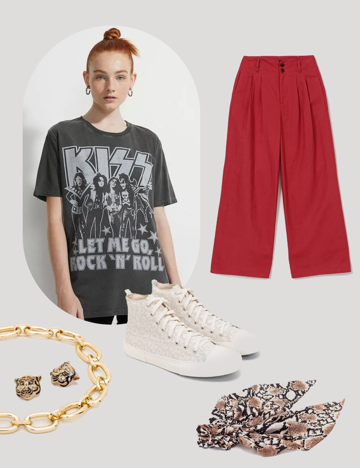 E pra curtir uma a noite com as amigas, a aposta está em um night look cheio de estilo. Que tal uma camiseta com estampa de banda, bem vintage? Junto com uma composição colorida, não vai ter ninguém mais cool que você!