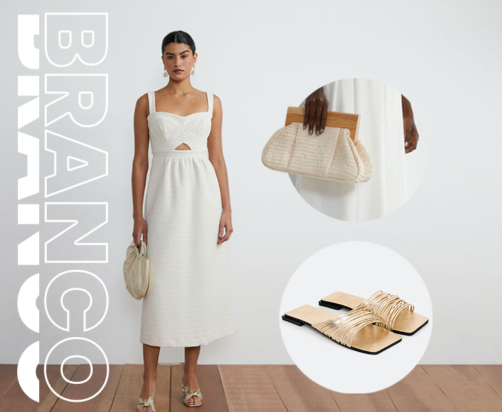 O branco é tradição nos looks de Ano Novo. A cor representa paz e consegue elevar o visual com muita elegância, independente da ocasião. Vai dizer que o vestido branco não merece ocupar espaço no seu visual além do Réveillon? O vestido midi é chiquérrimo e o seu detalhe texturizado deixa o look ainda mais especial. Não esqueça dos detalhes que vão complementar seu visual com muita sofisticação: bolsa de mão e sandálias com tiras.