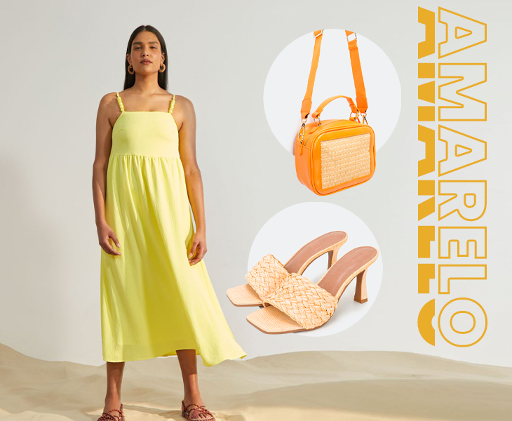 O amarelo ilumina a vida e, principalmente, o visual. A cor consegue deixar qualquer look mais alegre e cheio de vida. Use o vestido midi para começar o ano mais linda e seguir arrasando na alta temporada. Para o passeio no final de semana, aposte na praticidade da bolsa transversal combinada com o tamanco de bico quadrado.