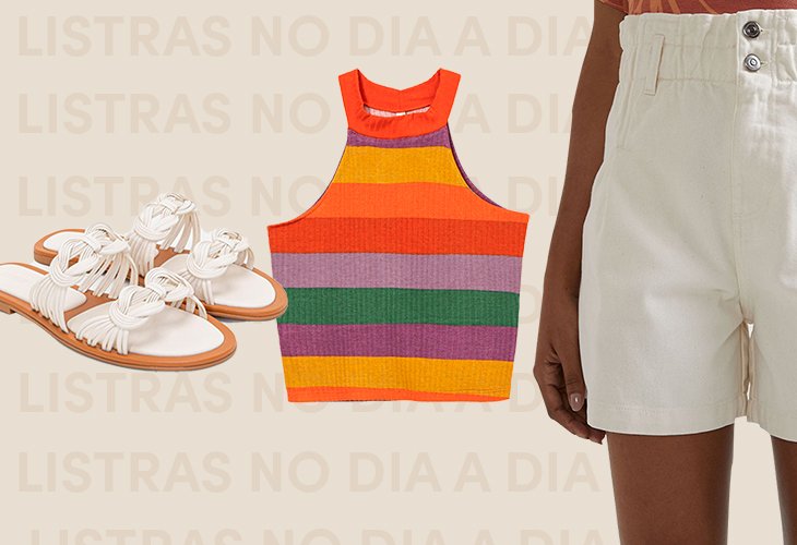 Para iluminar o visual, aposte no branco. A cor é elemento curinga para equilibrar as listras multicoloridas. Na hora de escolher o sapato, você tem dois caminhos: optar pelo visual chic&clean com a rasteirinha branca ou apostar no mix de conforto&praticidade dos tênis, que podem ser brancos ou coloridos, claro.