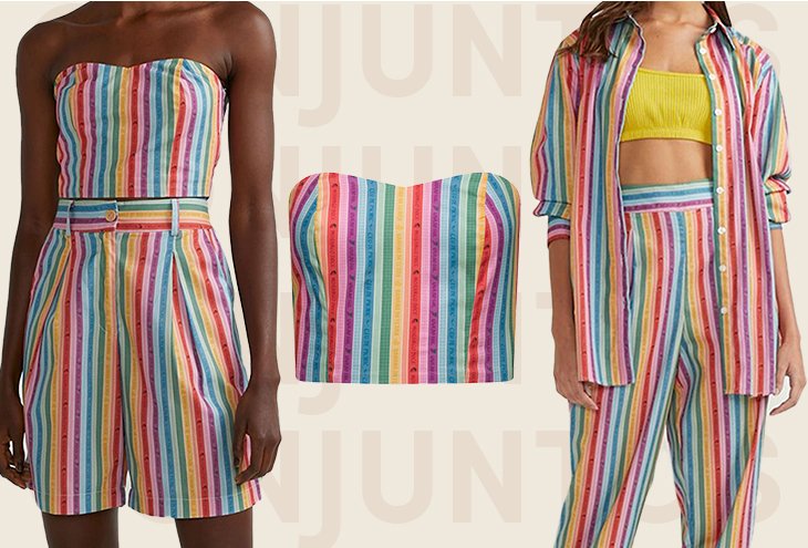 E aqui vão algumas dicas para usar as peças separadas: o cropped com wide leg é o lookinho prático e fashion, a bermuda com biquini + bucket hat cria a combinação perfeita para aquele pool party com as amigas, já a calça arco-íris com salto e body é o office look mais fashionista de todos.