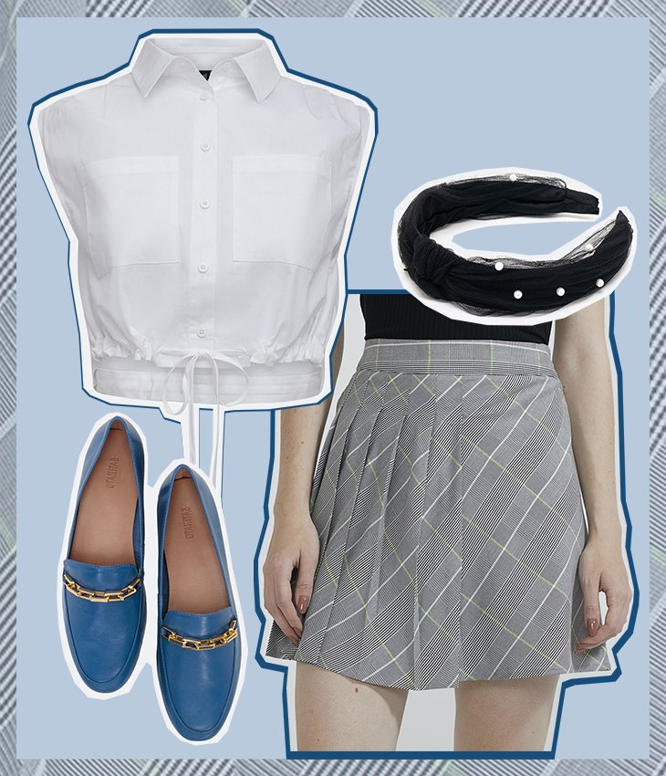 Contraponha a leveza da saia plissada com uma bota tratorada. Se a combinação estiver sem nenhum elemento de cor, coloque um lenço colorido no pescoço. Você também pode combinar o mocassim com meias coloridas ou fazer uma sobreposição da camisa branca alongada com um colete.