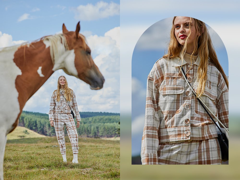 Nós já contamos nesse post que os tons neutros serão tendência na moda outono inverno 2022. Aqui, eles aparecem com outra tendência da estação: o xadrez. O conjunto traz um ar despojado e a união das cores claras com o quadriculado deixa as peças mais leves e harmoniosas.