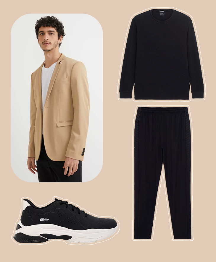 Experimentar é a palavra-chave do estilo casual masculino. Nessa proposta, a t-shirt esportiva também pode fazer bonito com blazer, sabia? Combine com uma calça jogger e tenha um visual versátil, que te deixa pronto para sair do trabalho e treinar.