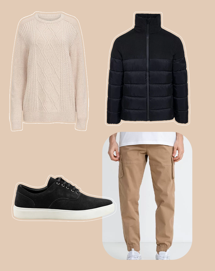 Uma jaqueta puffer, um blusão com texturas e uma calça despojada. Já pensou? Este é um look moderno e que vai te locomover por aí com bastante estilo e conforto.