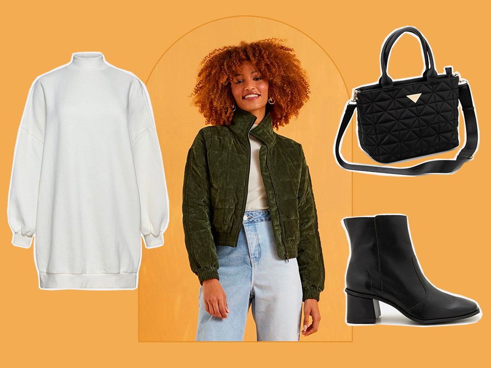 No sobe e desce de temperaturas, a jaqueta puffer aparece como salvação. Quando você quiser um look comfy e prático, combine o vestido de moletom com a jaqueta colorida. Para deixar a produção menos despojada, invista no salto e na moderníssima bolsa com textura matelassê.