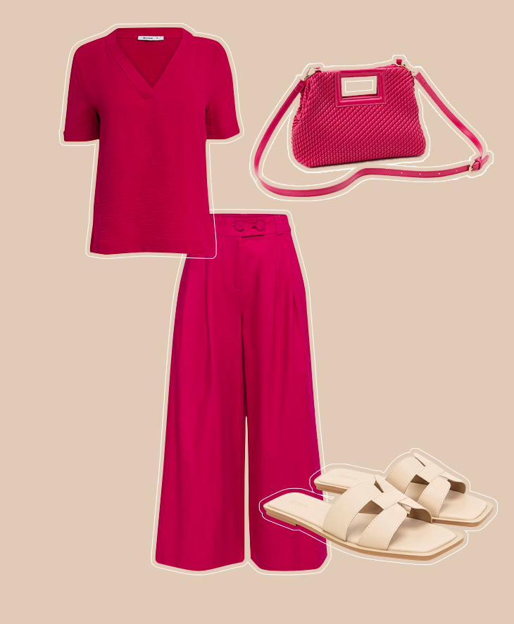 Sabe um look chique que dispensa comentários? É o monocromático. Aqui, temos um visual todo cor de rosa composto por uma calça pantalona, um blusa com decote V e uma bolsa clutch. Aliás, a modelagem ampla da calça traz um tom mais arrumado para qualquer look. O toque comfy fica por conta da rasteira.