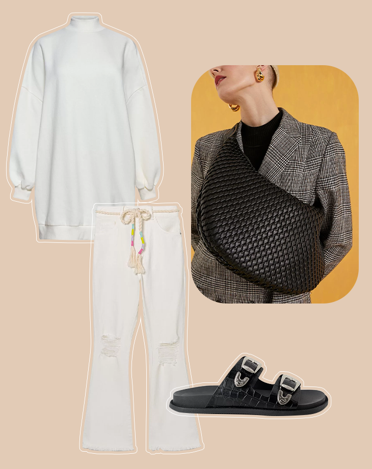 De casa para o dia a dia, os looks com moletom fazem sucesso. Aqui, a trend aparece atualizada, fugindo da tradicional calça de moletom. O vestido fica chique com a gola rolê e a manga bufante dá aquele toque fashion.