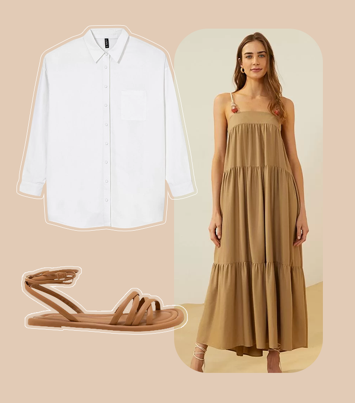Se você não dispensa o vestido no inverno, aposte no modelo breezy dress, aquele vestido bem amplo e fresquinho.  Para manter o look chique e ficar mais quentinha, adicione uma camisa branca com botões abertos por cima. Nos pés, vale uma sandália cheia de texturas para finalizar a combinação com charme e leveza.
