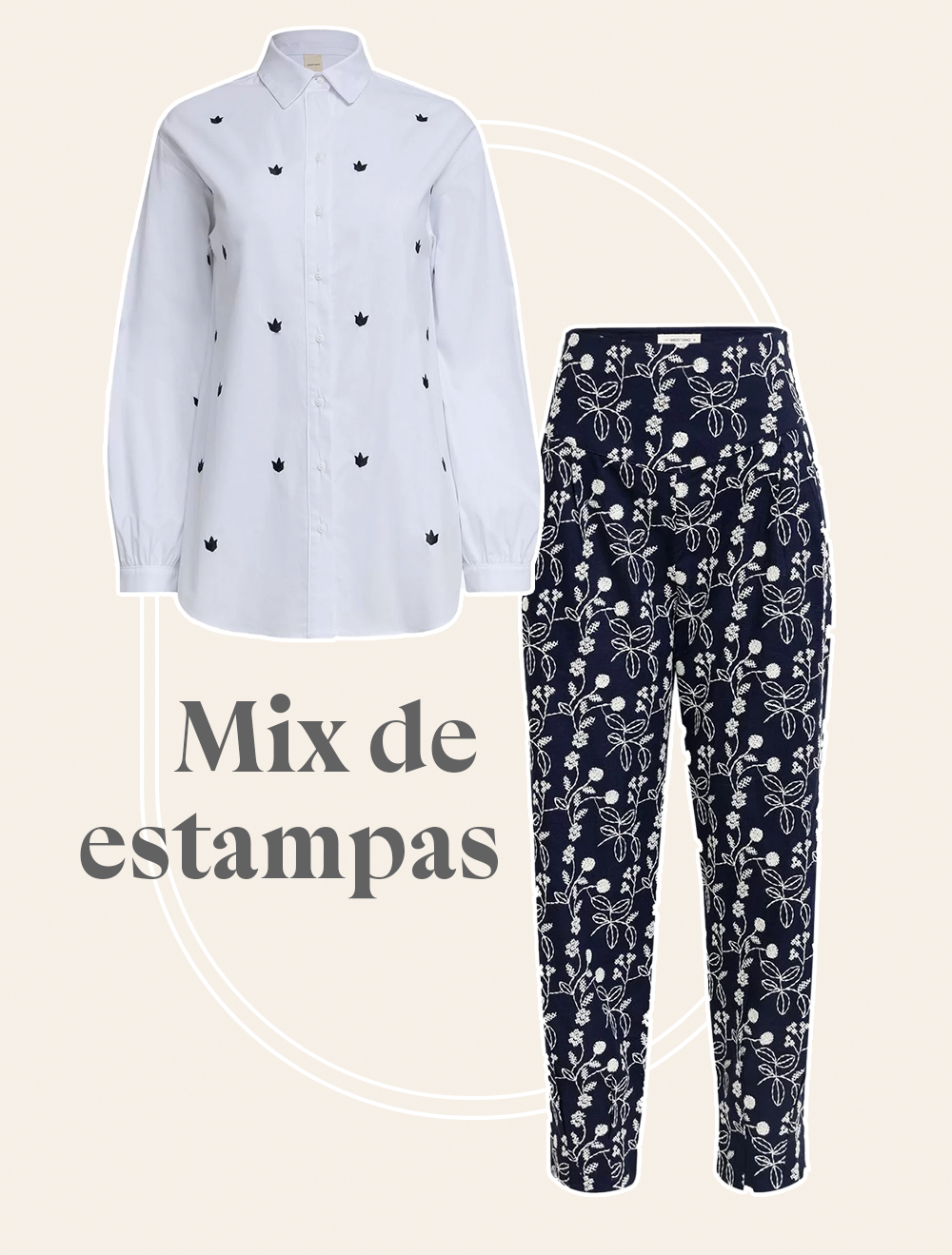 Enquanto a calça com bordado azul chama atenção logo de cara, a camisa com print floral aparece dar leveza à essa mistura. Que tal apostar nessa combinação e atualizar os seus looks para trabalhar?