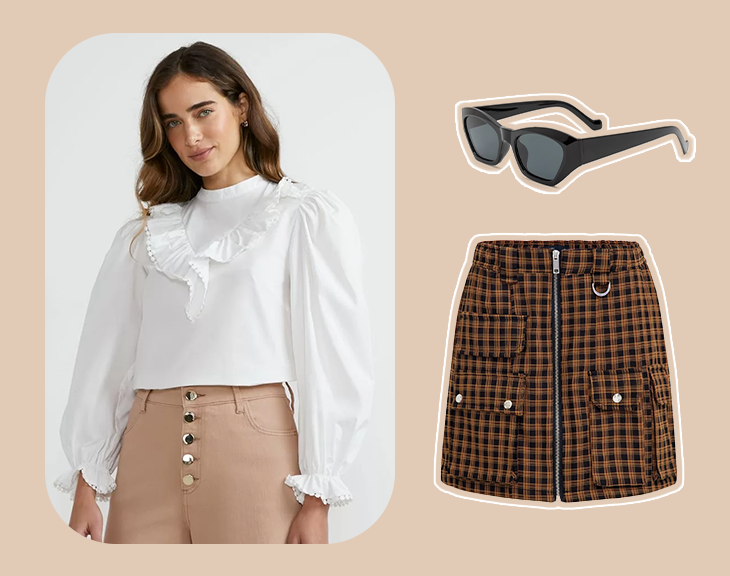 Na tendência grunge, também é possível investir em peças românticas. Nossa última proposta é para as fãs dos looks mais delicados e com detalhes únicos. Aposte em uma saia curta com padronagem xadrez, um óculos escuro e uma blusa com mangas bufantes.  A união dessas peças é charmosa e muito sofisticada.