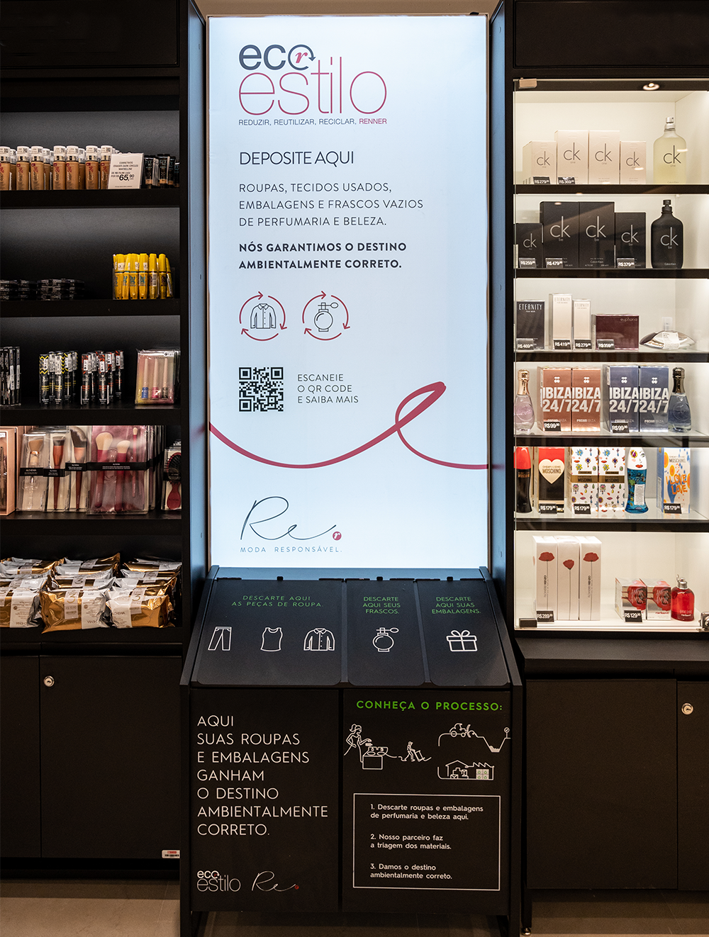 Oferecemos esse serviço aos clientes desde 2011 na categoria de perfumaria, com pontos de coleta em todas as lojas Renner. Todo tipo de frasco ou embalagem de perfumaria pode ser depositado nesses coletores, até mesmo de produtos que não tenham sido comprados com a gente, viu? E algumas lojas também recebem roupas em desuso. Nesse post, contamos tudo sobre o EcoEstilo!