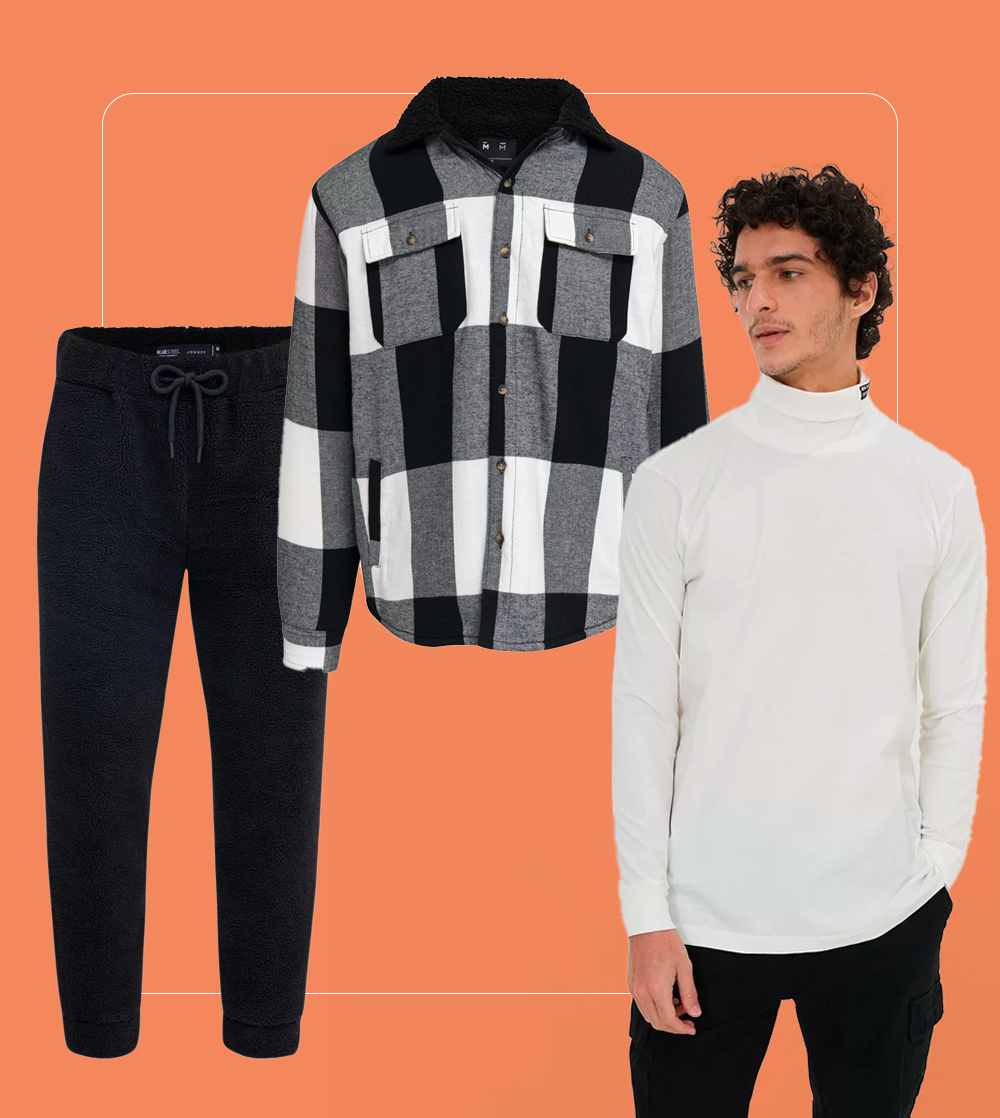 A gola alta off white é mesmo a queridinha de muitos! Sua tonalidade neutra é fácil de combinar com outras peças, como a clássica estampa xadrez e a calça jogger com textura em sherpa.