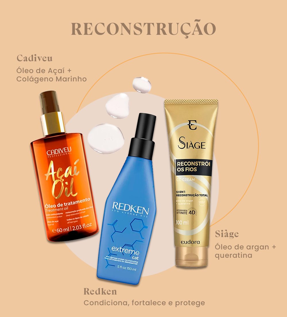 O tratamento de reconstrução age na reposição das proteínas essenciais para os cabelos, em especial a queratina. Produtos para reconstrução capilar normalmente são compostos por queratina, colágeno, arginina, creatina, entre outros, e são aplicados nos cabelos úmidos, sem necessidade de enxaguar depois.