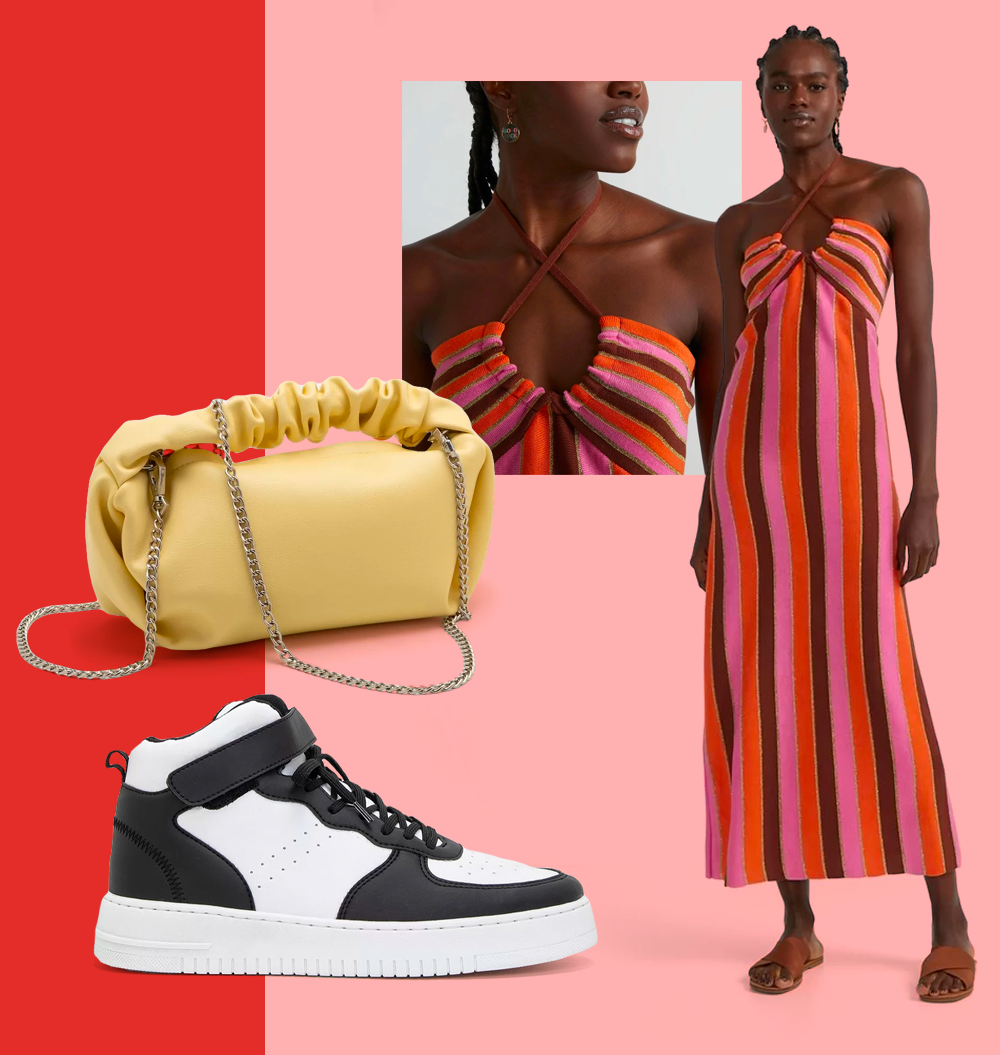 Se você quiser investir um pouco mais para agradar o seu amor, vem conferir mais essas opções. O tênis do momento é perfeito para surpreender, além do vestido midi e da bolsa colorida para criar composições fashionistas.