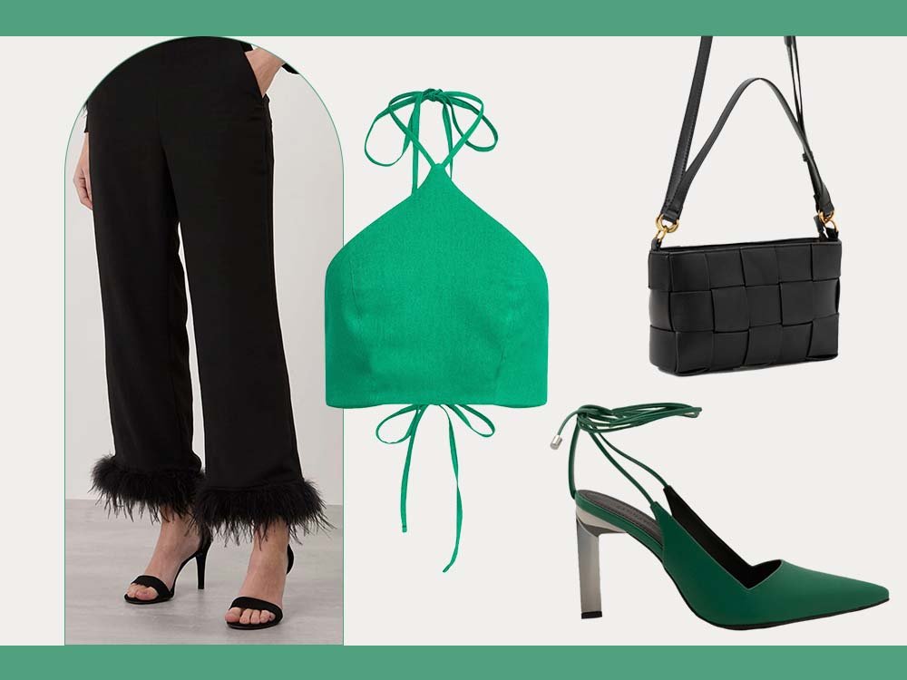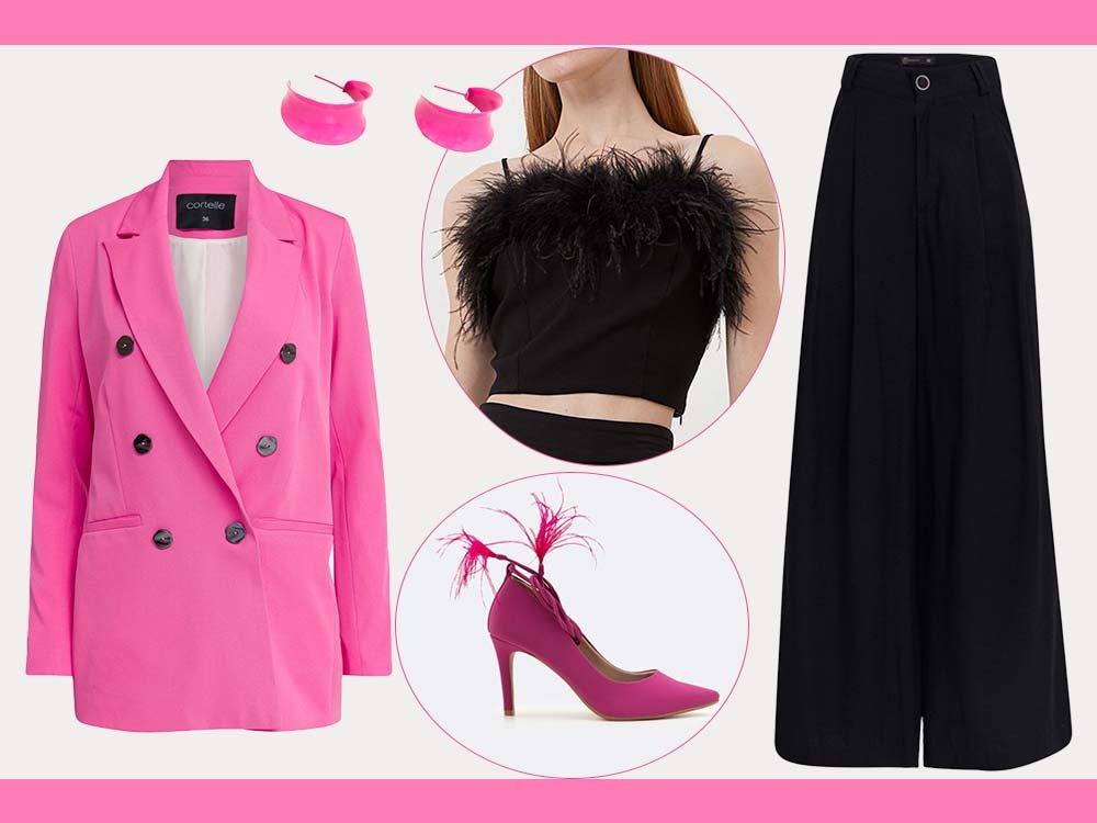 Ainda que o seu olhar vá diretamente para o pink estonteante do blazer, o cropped de plumas vai marcar presença dando movimento, elegância e estilo à sua produção. Já a sandália com plumas fica mais discreta com a pantalona preta, mas pode apostar: ela dá show de versatilidade com peças mais curtas, pantacourt, vestidos e shorts. Não tem erro!
