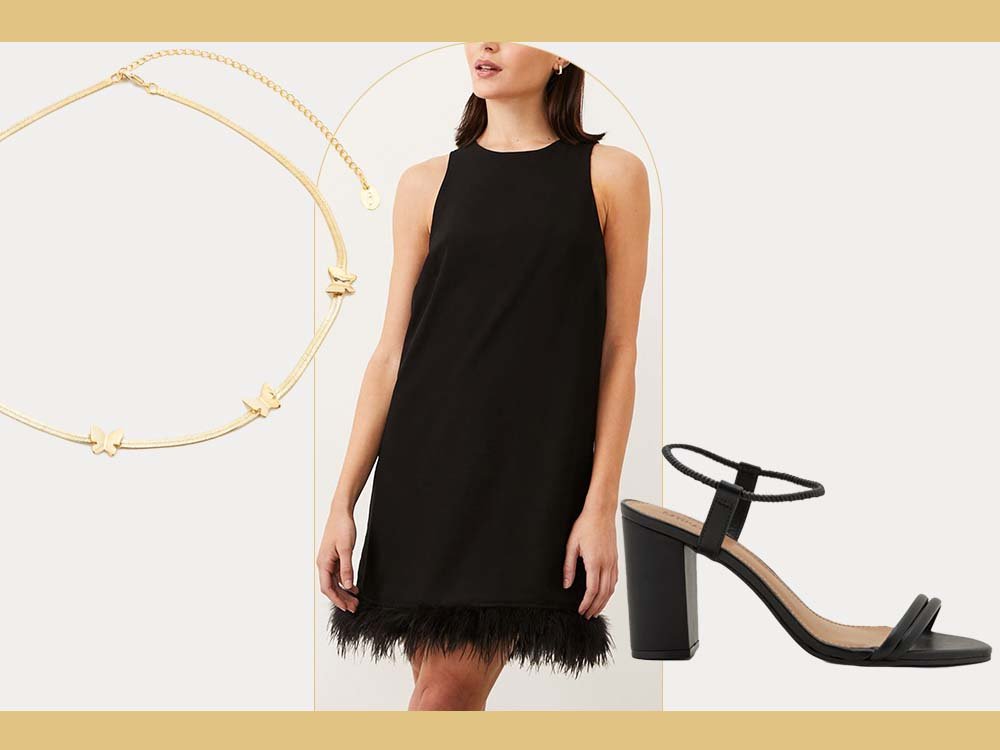 Para fugir do vestido preto básico, que tal dar um up nele com as plumas? Esse look preenche todos os requisitos: minimalista, chique e versátil numa peça só. Nessa proposta, as plumas ganham foco total, por isso, o restante da composição leva itens mais discretos, como a sandália preta com tiras e a gargantilha curta.