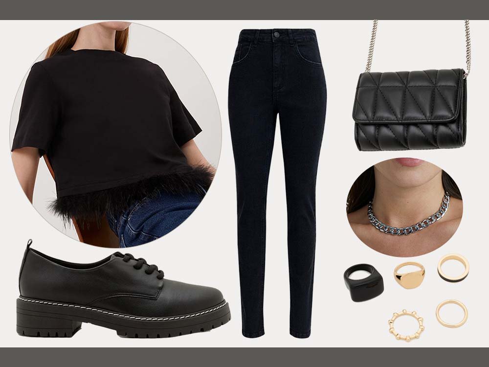 E no dia a dia, as plumas têm espaço? Com certeza! A calça jeans equilibra as plumas com muita harmonia. Se você pensa que as plumas não podem ser versáteis, está enganada. Olha como a blusa com plumas encaixa-se perfeitamente em um contexto mais casual, misturando-se com peças básicas. Aliás, você reparou na paleta dessa composição? Monocromático que fica ainda mais estiloso com os acessórios dourados e prateados.