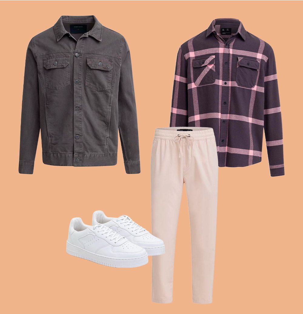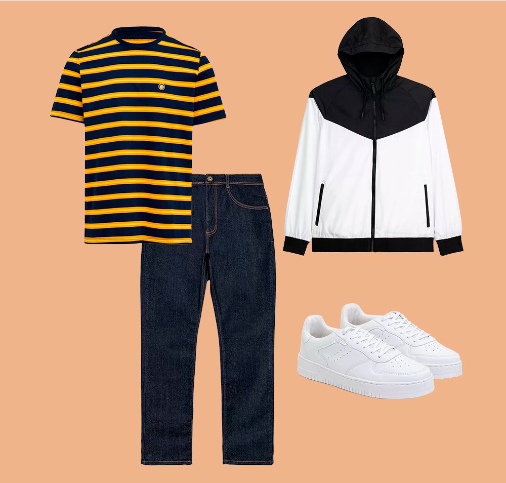 Caso você goste de looks confortáveis e estilosos, a jaqueta corta-vento, peça-chave do estilo casual masculino, não pode faltar na sua mala. Esse modelo protege nos dias de chuva (o que a gente torce para não acontecer no seu passeio) e é excelente para usar nas regiões com clima ameno. Fique à vontade para fazer combinações com estampas, como a blusa listrada.