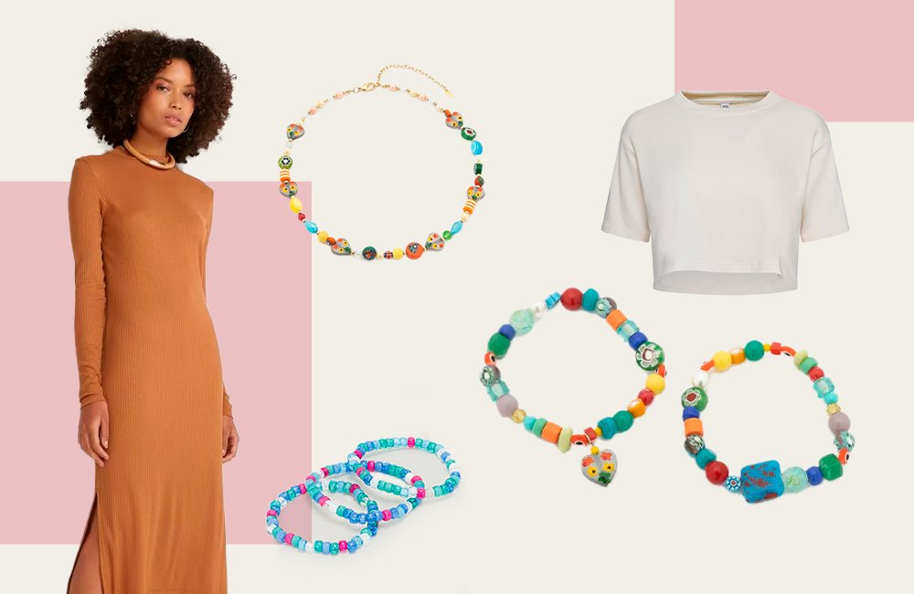 Na moda anos 90 e 2000, as cores pastel brilhantes estavam por toda a parte. Além dos adesivos, materiais de papelaria e itens escolares, os colares, pulseiras e anéis de miçangas abusavam – e abusam – dessas tonalidades. Mas, para a versão revival dos anos 2020, não é preciso se limitar ao estilo lúdico e extravagante para aderir à tendência – também é possível ter um look sóbrio e casual com um toque descontraído usando esses adereços.
