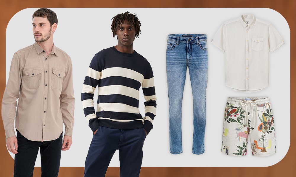 Ele não quer vestir mais do mesmo e gosta do que é tendência, seja com modelagens diferentes — como as calças joggers — ou estampas que fogem do tradicional, feitas com tecidos que tenham um caimento diferente (as camisas em viscose são perfeitas!). Peças que fogem do básico, como coletes, também são bem-aceitas.