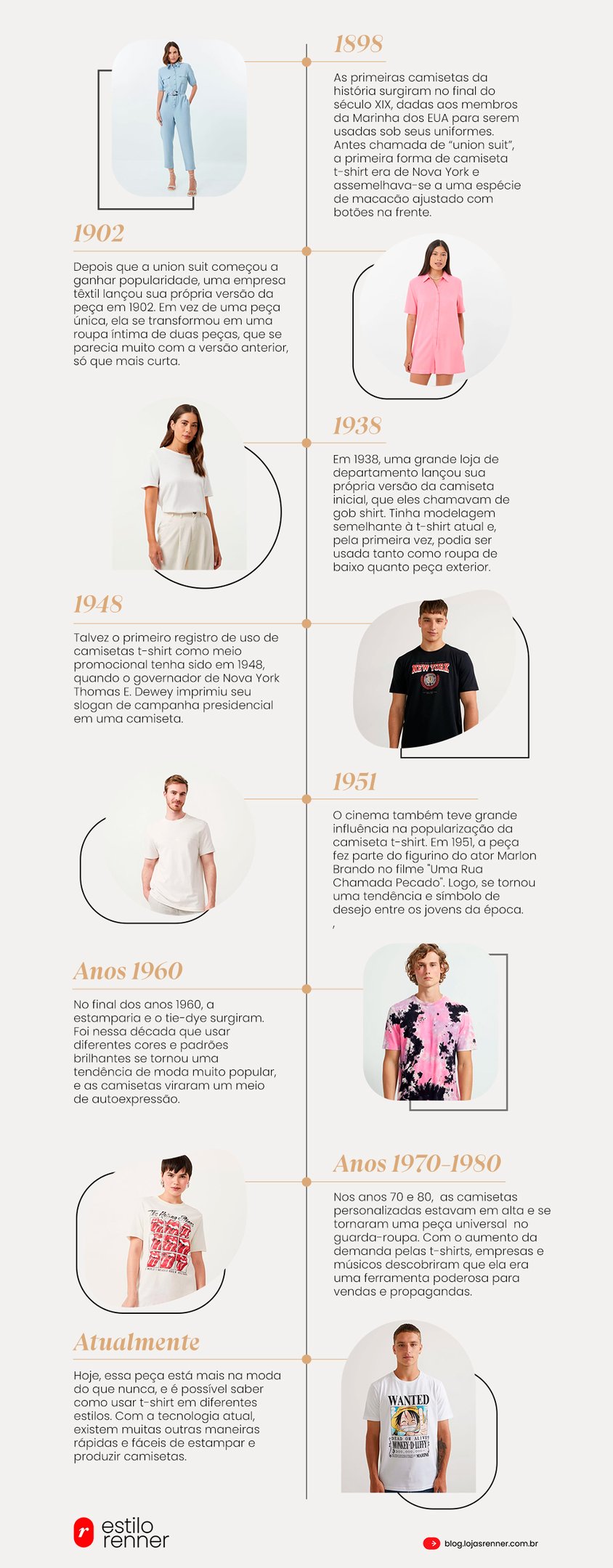De sua invenção até os dias atuais, os modelos de t-shirt passaram por diversas evoluções e foram usados com diferentes propósitos. Hoje, os looks com t-shirt são ícones do estilo casual e funcionam em qualquer estação.