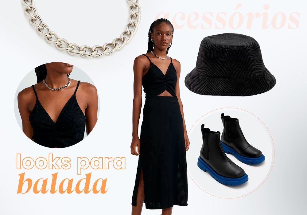 Por isso, para um vestido midi preto, adicionar um chapéu bucket da mesma cor é uma ótima forma de demonstrar o seu lado fashion e estiloso. Que tal complementar o look com uma bota cano médio tratorada, que está super em alta e cai como uma luva para esse comprimento de vestido? Finalize com um colar de corrente, aproveitando o espaço do decote.