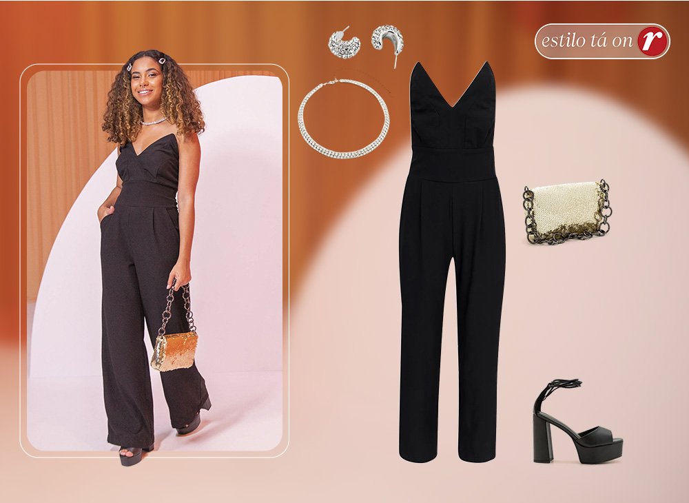 Nessa proposta elegante, ela optou pelo macacão longo. O decote V é o destaque da produção, pois é o detalhe que deixa a peça mais chique. Como o strass segue fazendo sucesso, os acessórios com essa pedra, como brincos, presilhas e choker são ideais para completar looks sofisticados. Para deixar ainda mais glamuroso, finalize com bolsa de paetê.