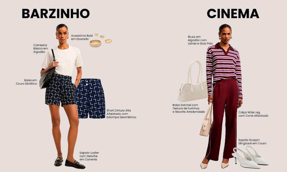 - pense no horário do encontro: durante o dia, a moda casual, os tecidos leves e as cores claras fazem mais sentido, enquanto um look para noite permite tons profundos, brilho discreto e recortes atuais;