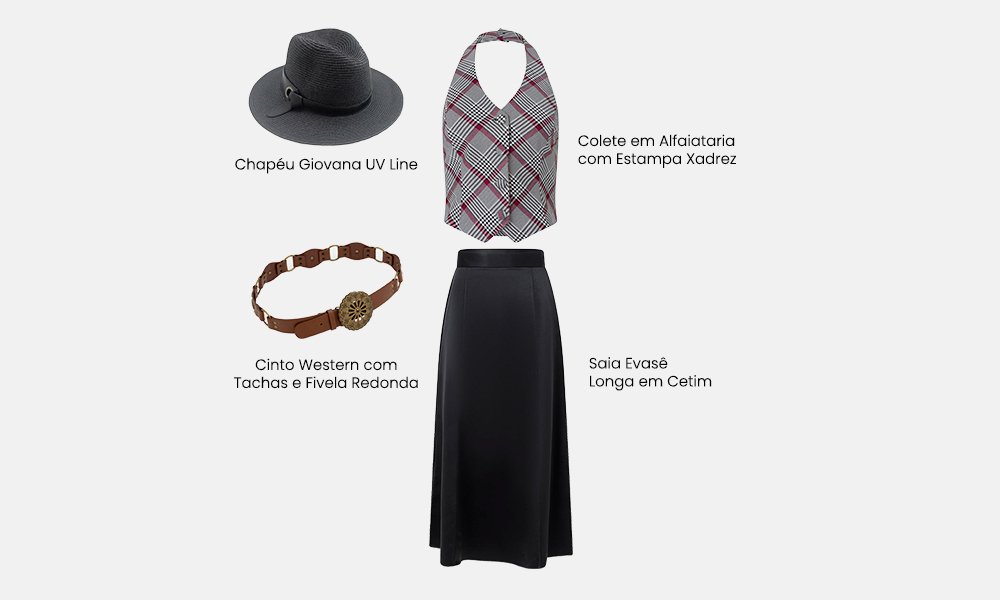 - country: é bem estruturado, com aba larga e topo firme e alto. Aparece em diferentes materiais e detalhes, trazendo um estilo western marcante;