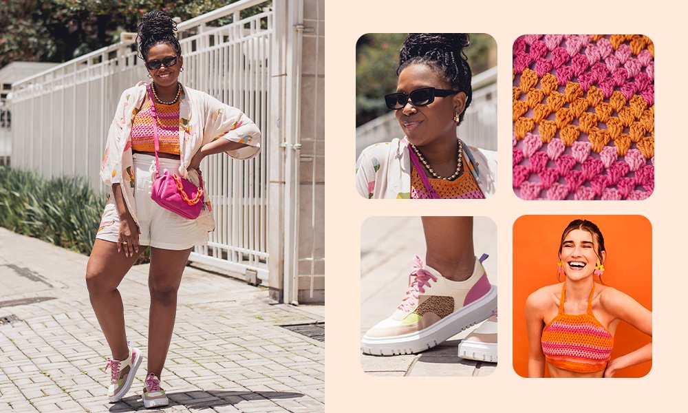 Primeiramente, escolha as cores da temporada! É mais fácil trazer uma carinha moderna para uma peça utilizando os elementos vigentes. Aqui, escolhi uma peça com laranja e rosa, pois foram as cores protagonistas dos últimos meses. Segunda dica, pense em modelagens mais ousadas ou modernas. Saias mídis, tops, croppeds, também por estarem em alta, adicionarão mais “borogodó” ao seu look com crochê. Terceira dica, combinação! É a sua composição também que vai dizer tu-do! Para trazer aspectos mais joviais, combine com shorts, tênis e muitos acessórios.