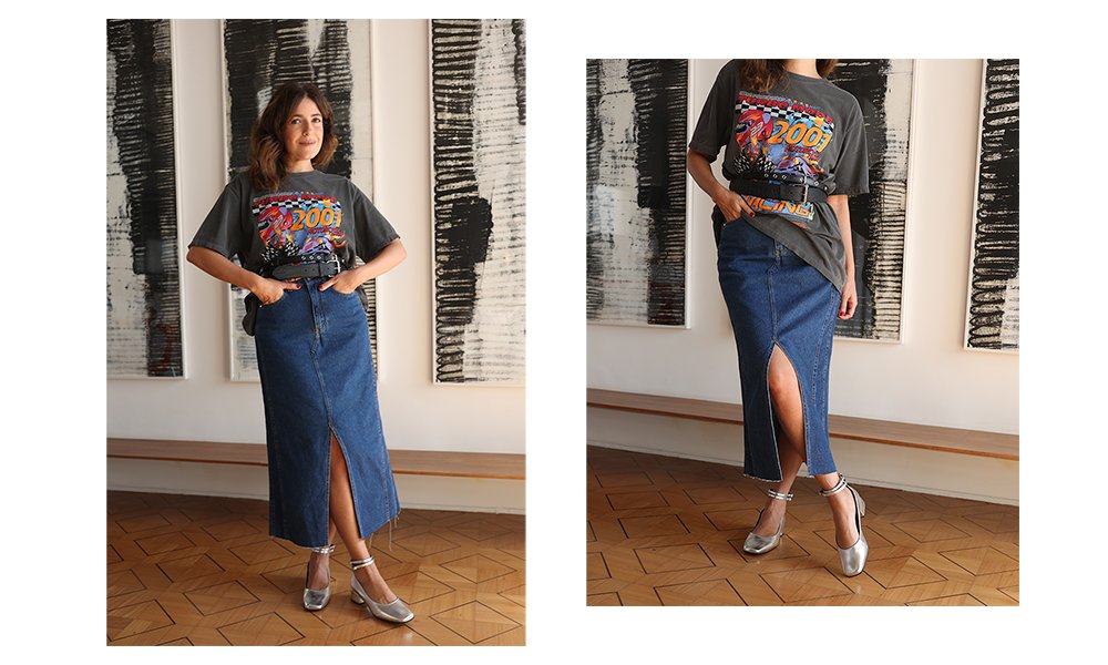 Comecemos com um look que pode até parecer básico, mas guarda vários truques de styling. A saia com uma fenda já quebra o mood comportado e, quando combinada à camiseta estampada, fica despretensiosa. Também ajuda o fato de ela ter um shape reto e minimalista.